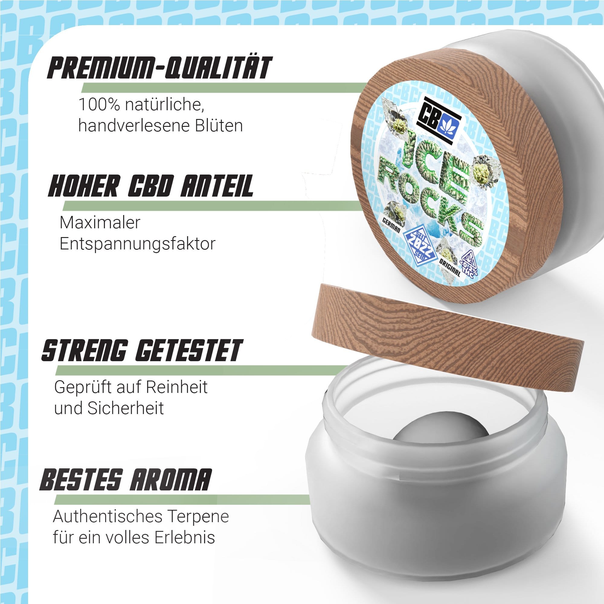 Unsere Ice Rocks werden aus den besten CBD-Blüten hergestellt und mit einer Schicht aus reinem CBD-Isolat überzogen. Diese Premium-Produkte sind frei von jeglichen Verunreinigungen und garantieren höchste Qualität und Reinheit. Für ein unverfälschtes und intensives CBD-Erlebnis.