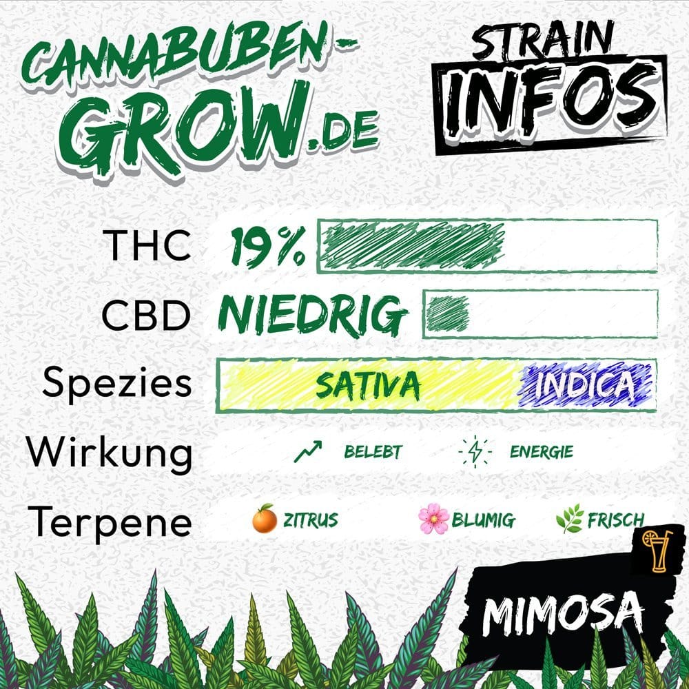 Lernen Sie die faszinierende Mimosa-Sorte von Cannabuben kennen, die durch ihr unvergleichliches Zitrusaroma und ihren fruchtigen Geschmack überzeugt. Diese Sorte vereint die besten Eigenschaften von Clementine und Purple Punch und garantiert ein echtes Highlight für alle Sinne. Mit intensiven Noten von saftigen Orangen und frischen Zitronen sorgt Mimosa für ein lebendiges und frisches Raucherlebnis, das jeden Zug zu einem spritzigen Vergnügen macht. Für alle, die eine fruchtige Cannabis-Sorte mit belebendem Charakter suchen, ist Mimosa ein absoluter Geheimtipp.