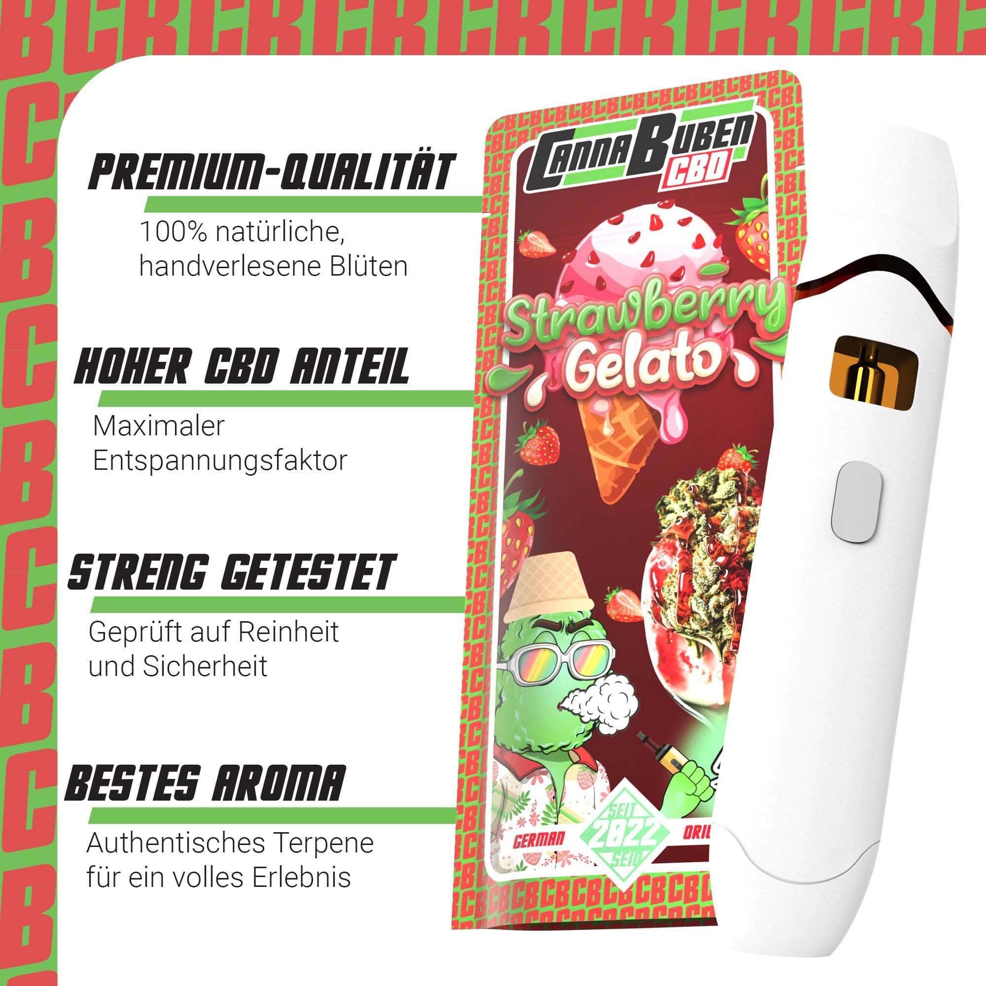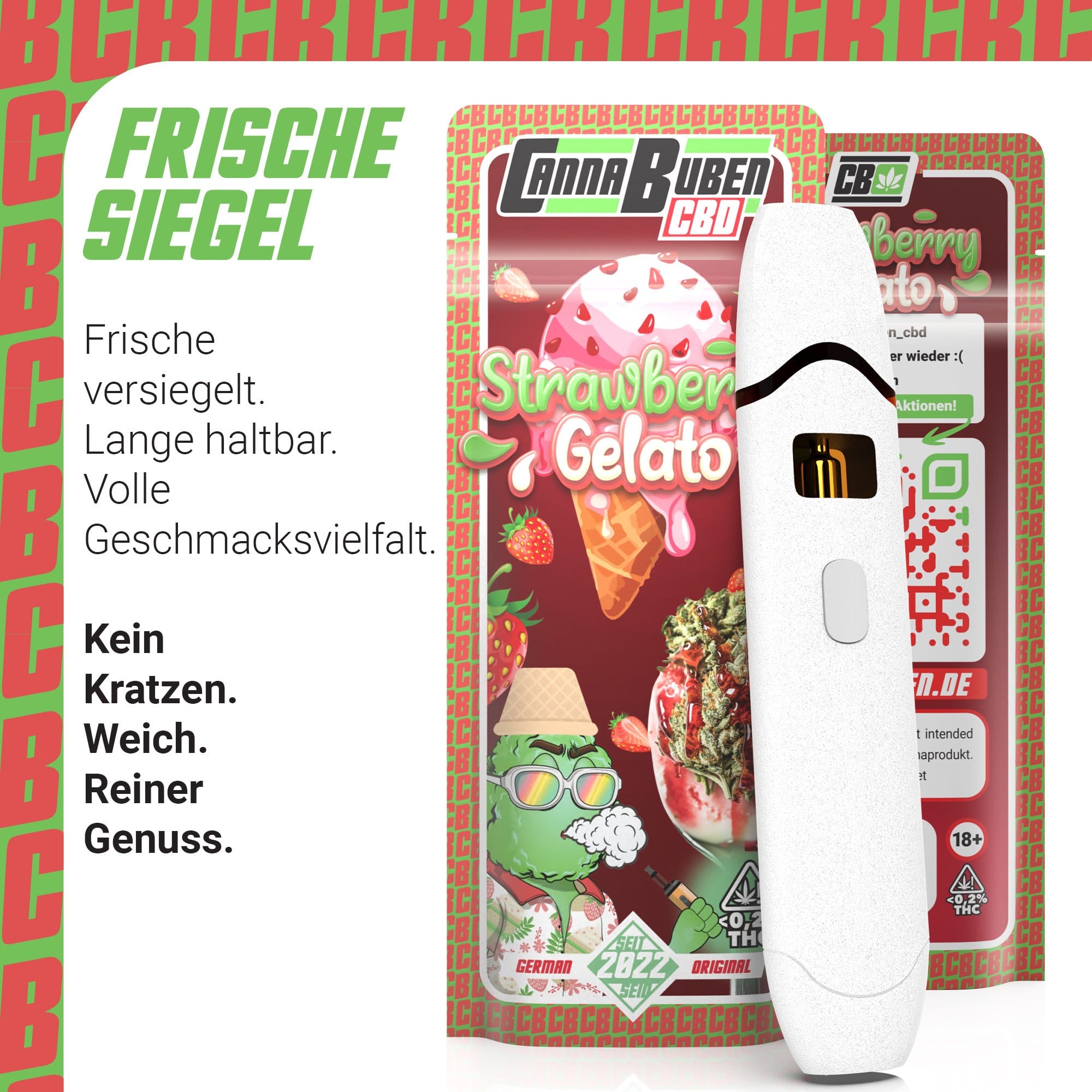 Unser Strawberry Gelato CBD Vape wird aus natürlichen Zutaten hergestellt und garantiert höchste Qualität und Reinheit. Frei von künstlichen Zusätzen bietet es einen sanften Dampf und ein angenehmes CBD-Erlebnis, das dich in süße Entspannung versetzt. Ideal für Genießer, die das Besondere schätzen.