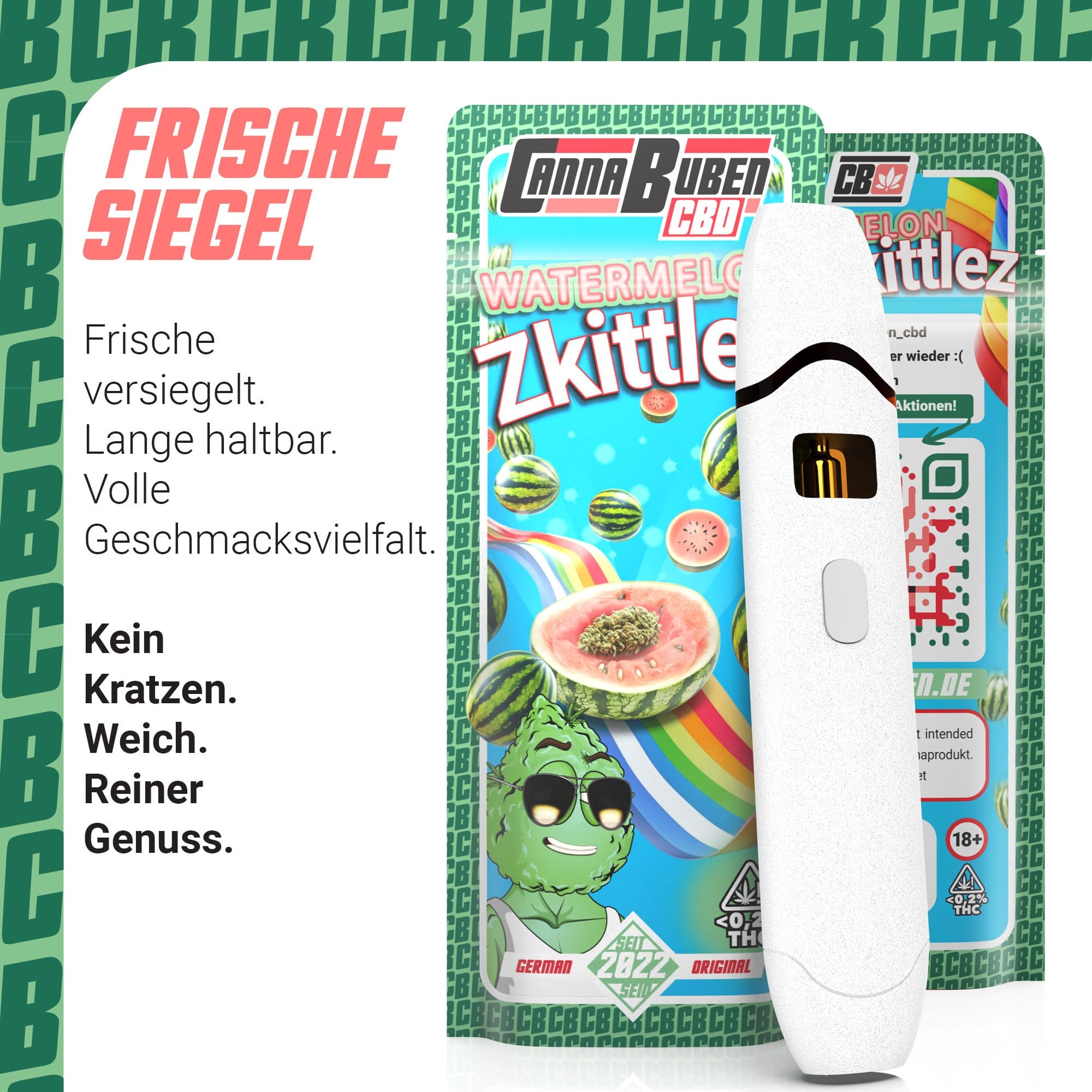 Unser Watermelon Zkittlez CBD Vape wird ausschließlich aus hochwertigen, natürlichen Inhaltsstoffen hergestellt. Ohne künstliche Zusätze garantiert es ein sanftes und intensives Dampferlebnis. Der sorgfältig extrahierte CBD-Extrakt sorgt für eine harmonische Wirkung, die perfekt mit dem tropischen Aroma harmoniert.